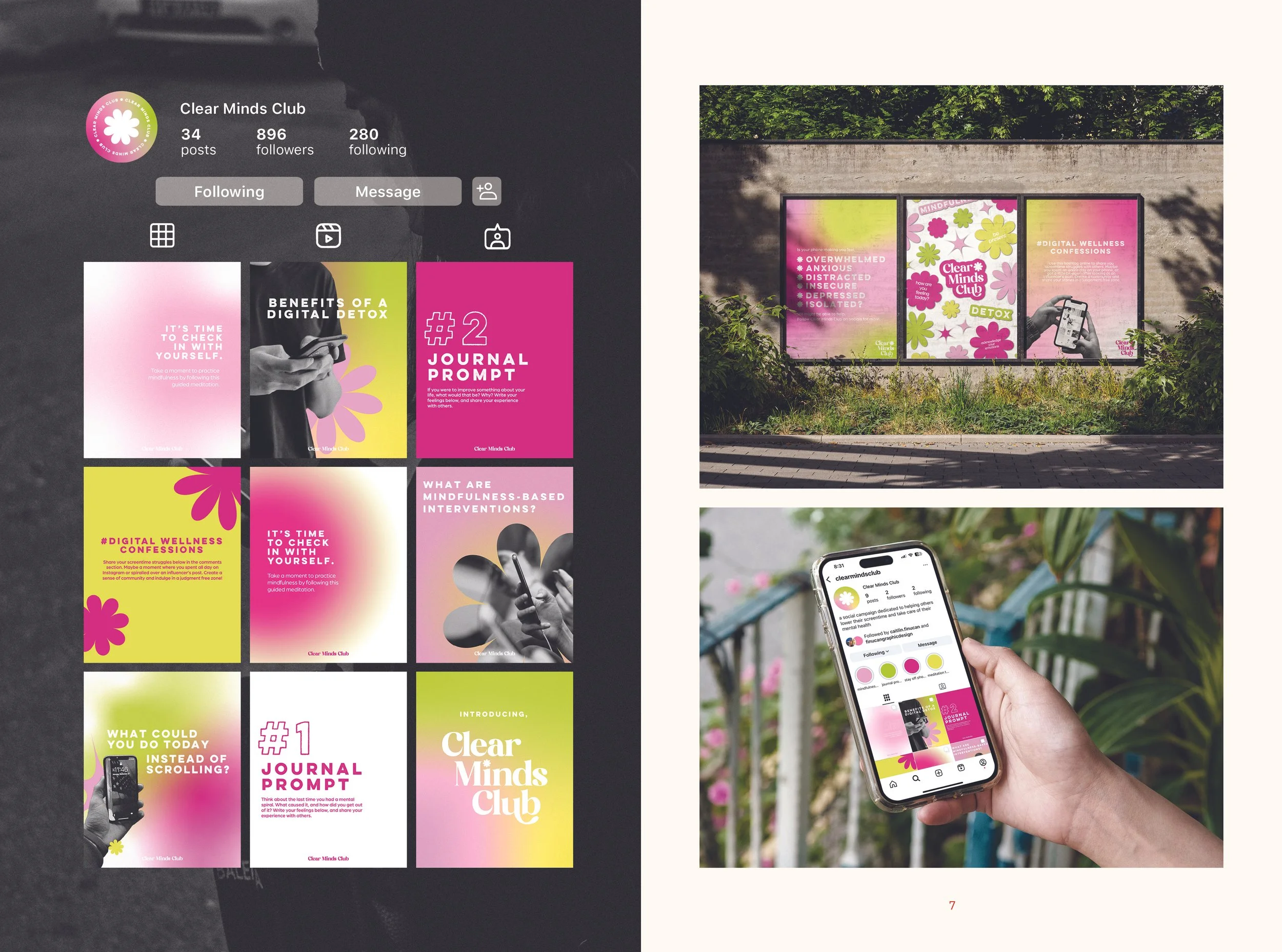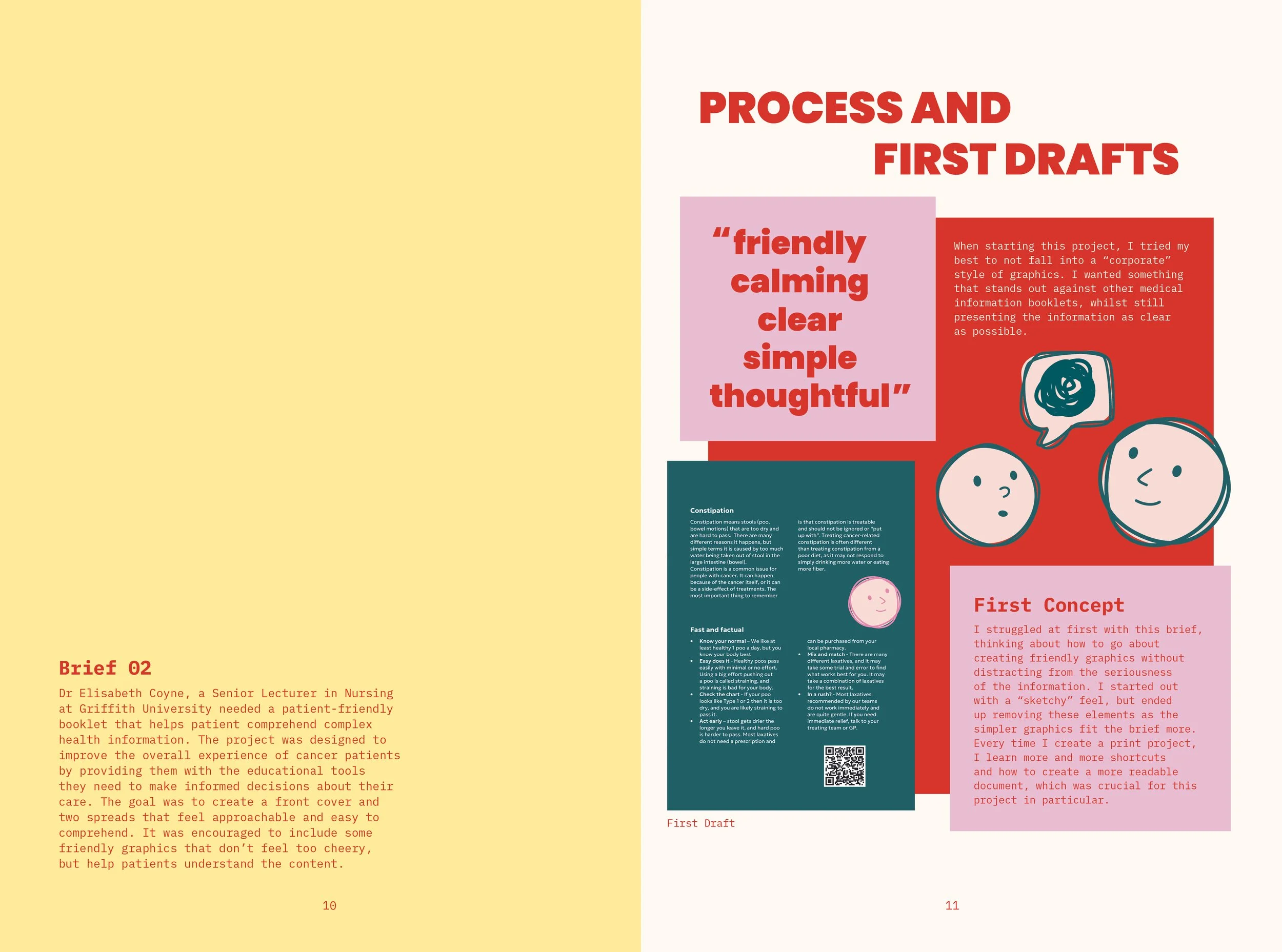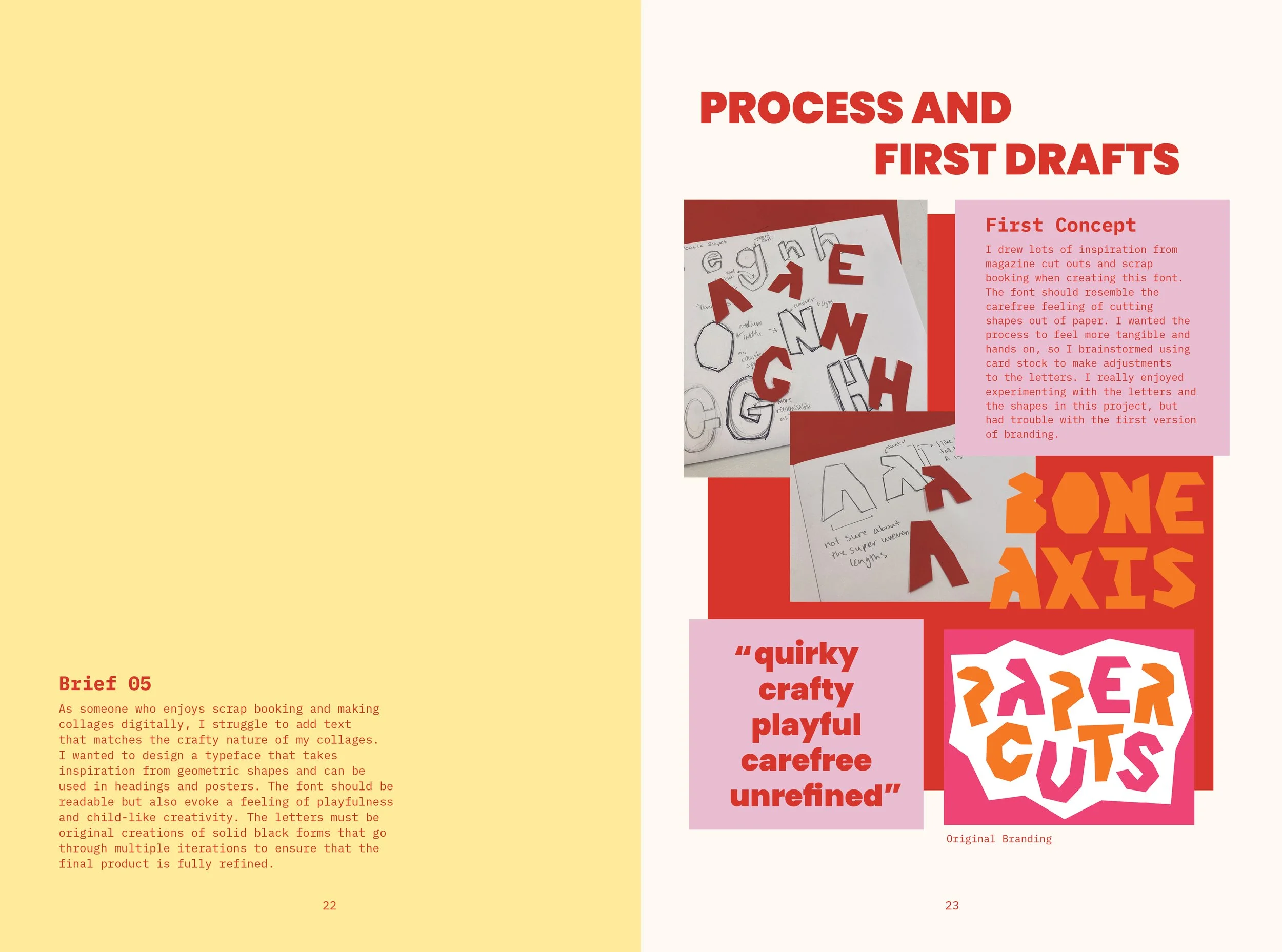 Each project starts with the brief and a little section about how I went about each project. I then show the project deliverables on the next spread. I wanted this project to show my design process from start to finish so future employers know how I operate and the range of tools I can use.